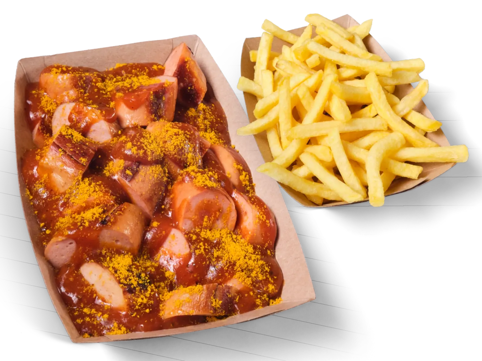 Doppelte Portion Currywurst mit frischen Pommes