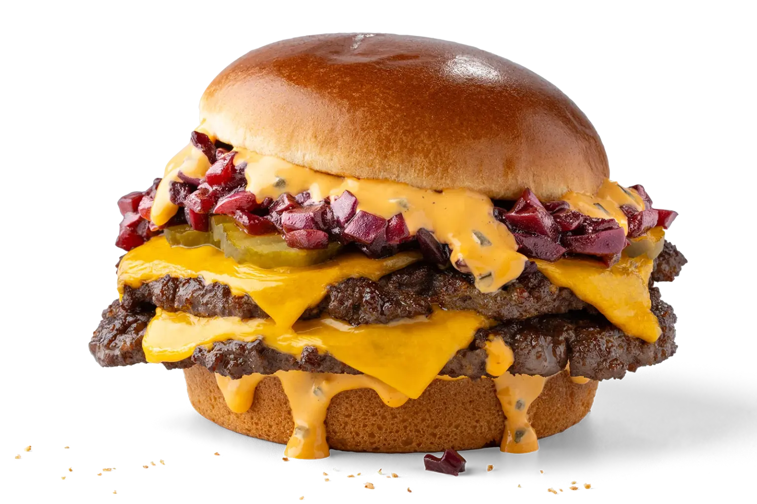 Cheddar Cheese*, Burger Sauce, Gewürzgurken, karamellisierte Zwiebeln